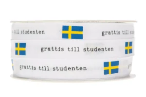 Presentband i bomull med text och Sveriges flagga grattis till studenten