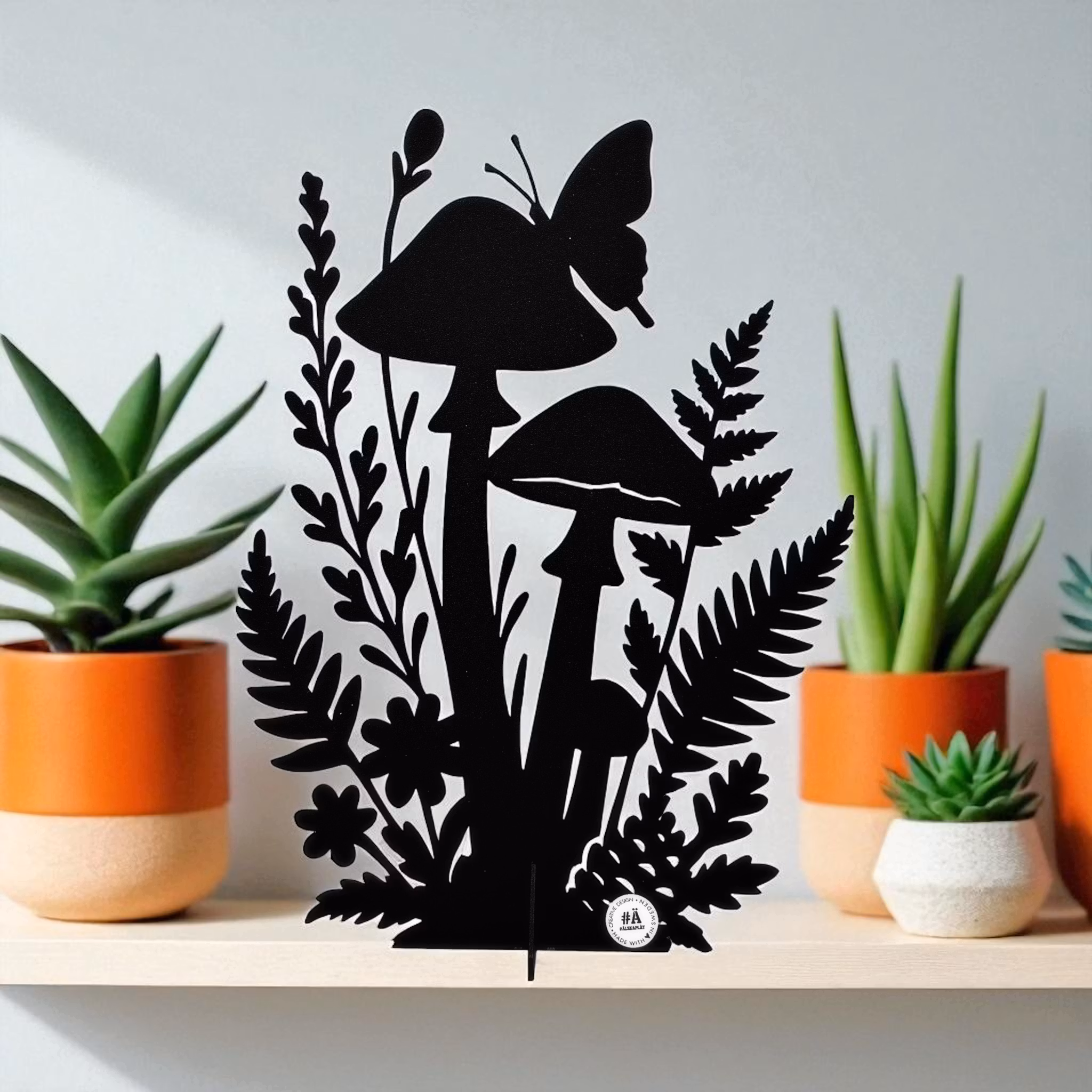 Flera stilrena flugsvampar står tillsammans bland gräs och kottar – som hämtade ur en sagoskog. Den lekfulla siluetten för tankarna till barndomens skogspromenader och blir ett vackert blickfång i både fönster, på hyllan eller ute i trädgården.