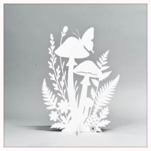 Flera stilrena flugsvampar står tillsammans bland gräs och kottar – som hämtade ur en sagoskog. Den lekfulla siluetten för tankarna till barndomens skogspromenader och blir ett vackert blickfång i både fönster, på hyllan eller ute i trädgården.