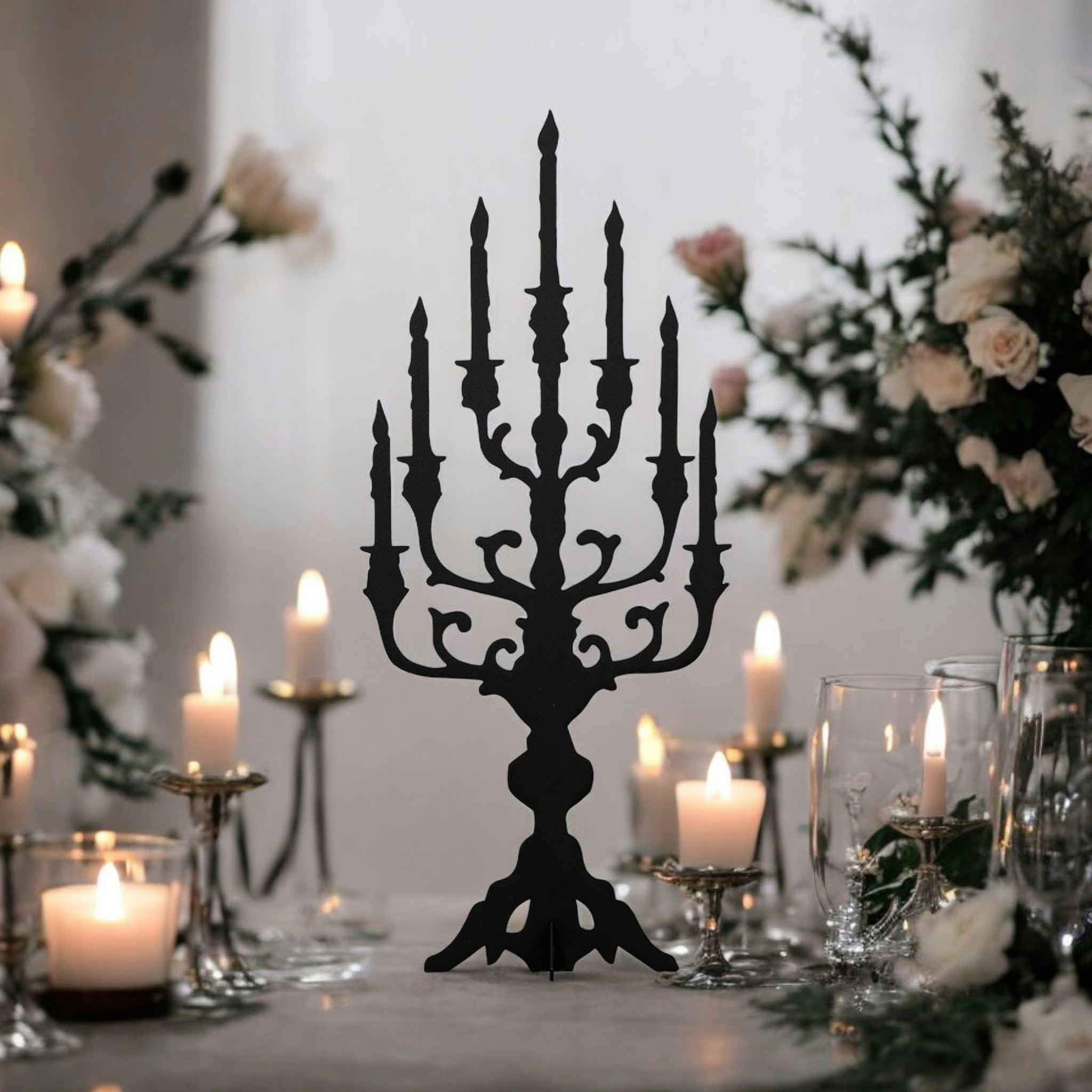 Skapa en stämningsfull atmosfär med denna konstnärliga kandelabersiluett- ett stilrent och underhållsfritt alternativ som aldrig går ur tiden