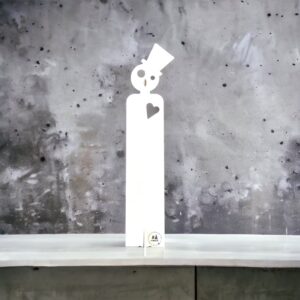 En inte alldeles perfekt VIT pepparkaksgubbe med ögon som korinter och hatten på sne´i vit plåt. Den blir ett fint tillskott i Luciatåget.