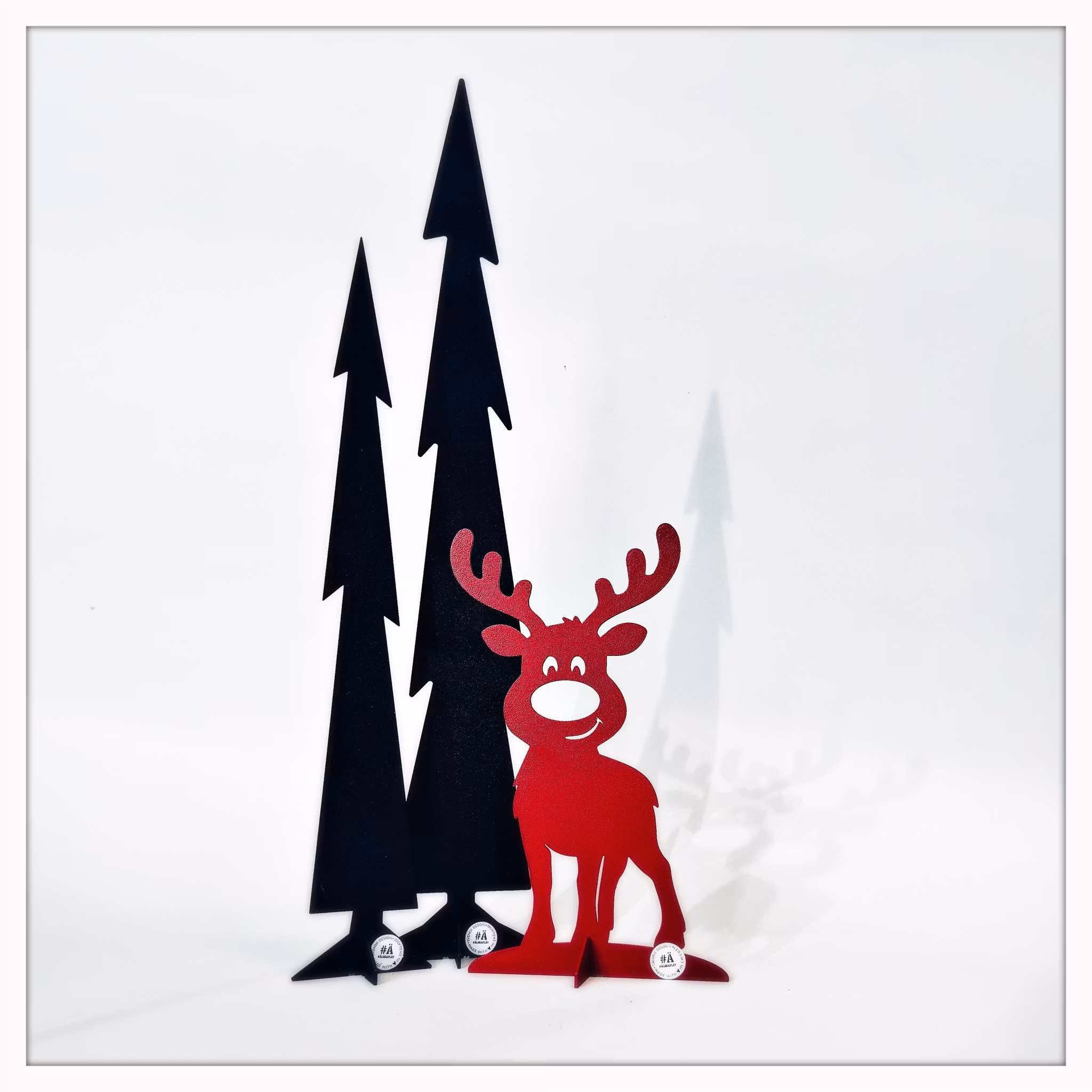 Rudolf finns i trefärger: svart, vit och röd – var och en med sin egen charm. Han passar alldeles förträffligt ihop med våra granar och tallar i plåt, och tillsammans skapar de ett stämningsfullt vinterland av värme, ljus och glädje.